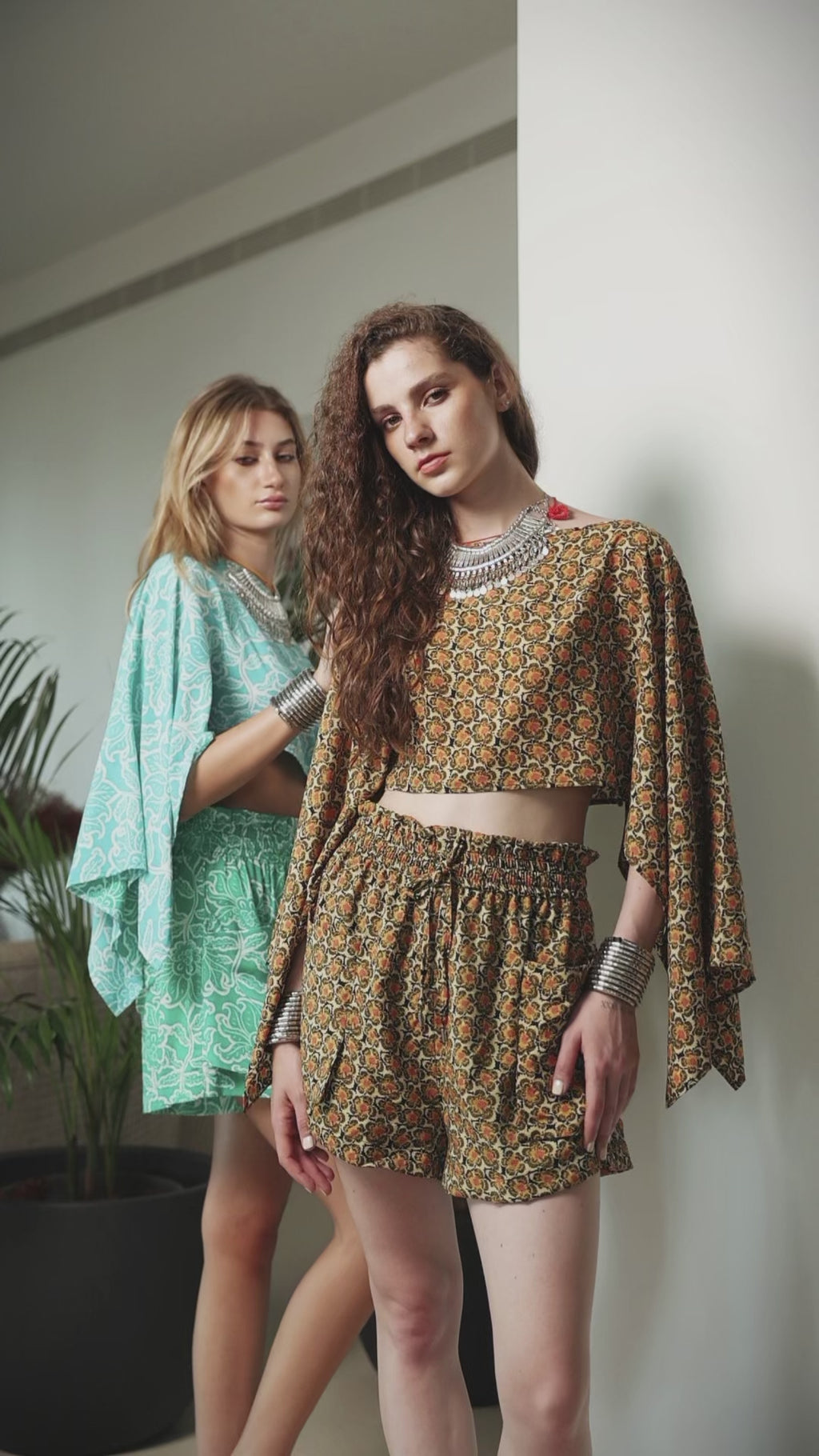 This two-piece set pairs a billowy wide-sleeve top with relaxed-fit shorts featuring an easy, elastic waist. Designed for movement, comfort, and effortless style. Whether you're lounging, traveling, or relaxing, its for a casual day out, that sets to brings softness and shape together in perfect balance.