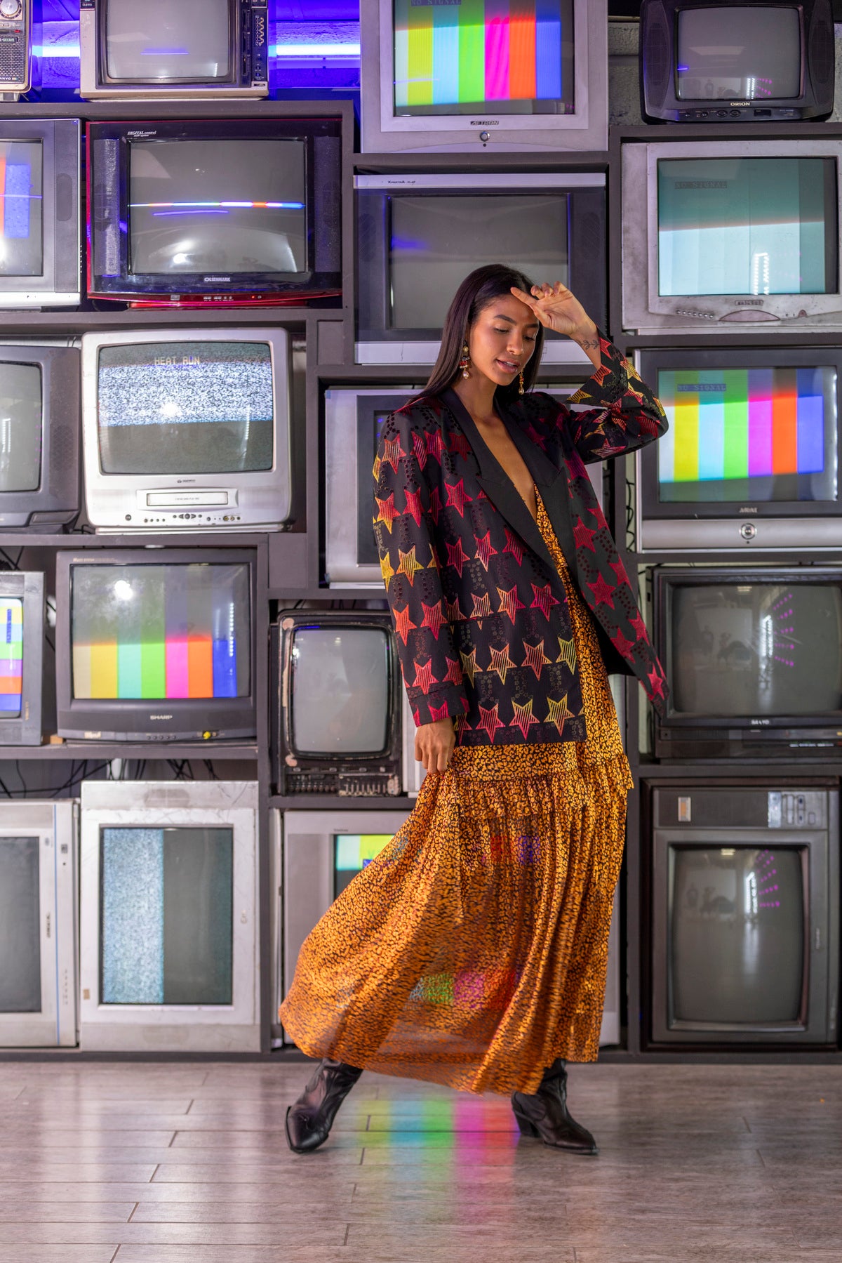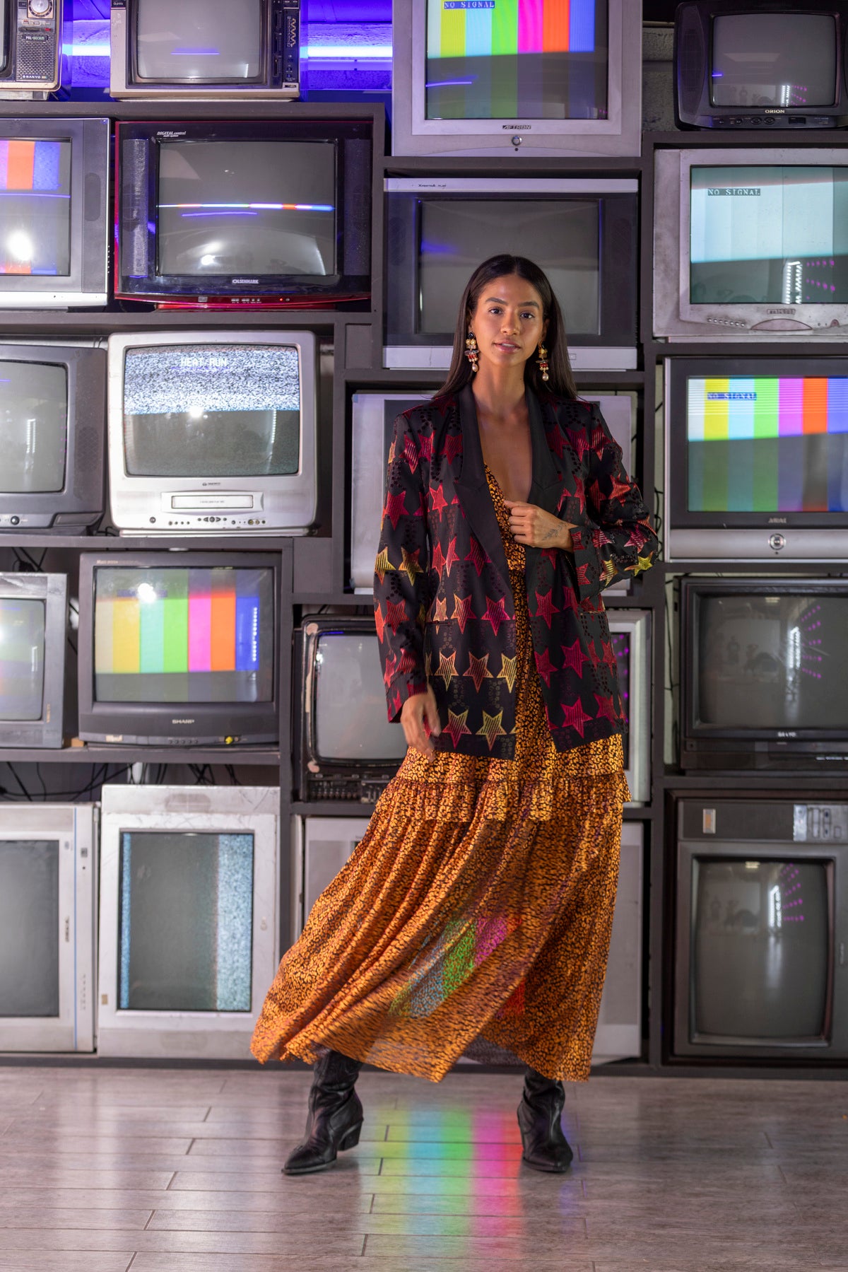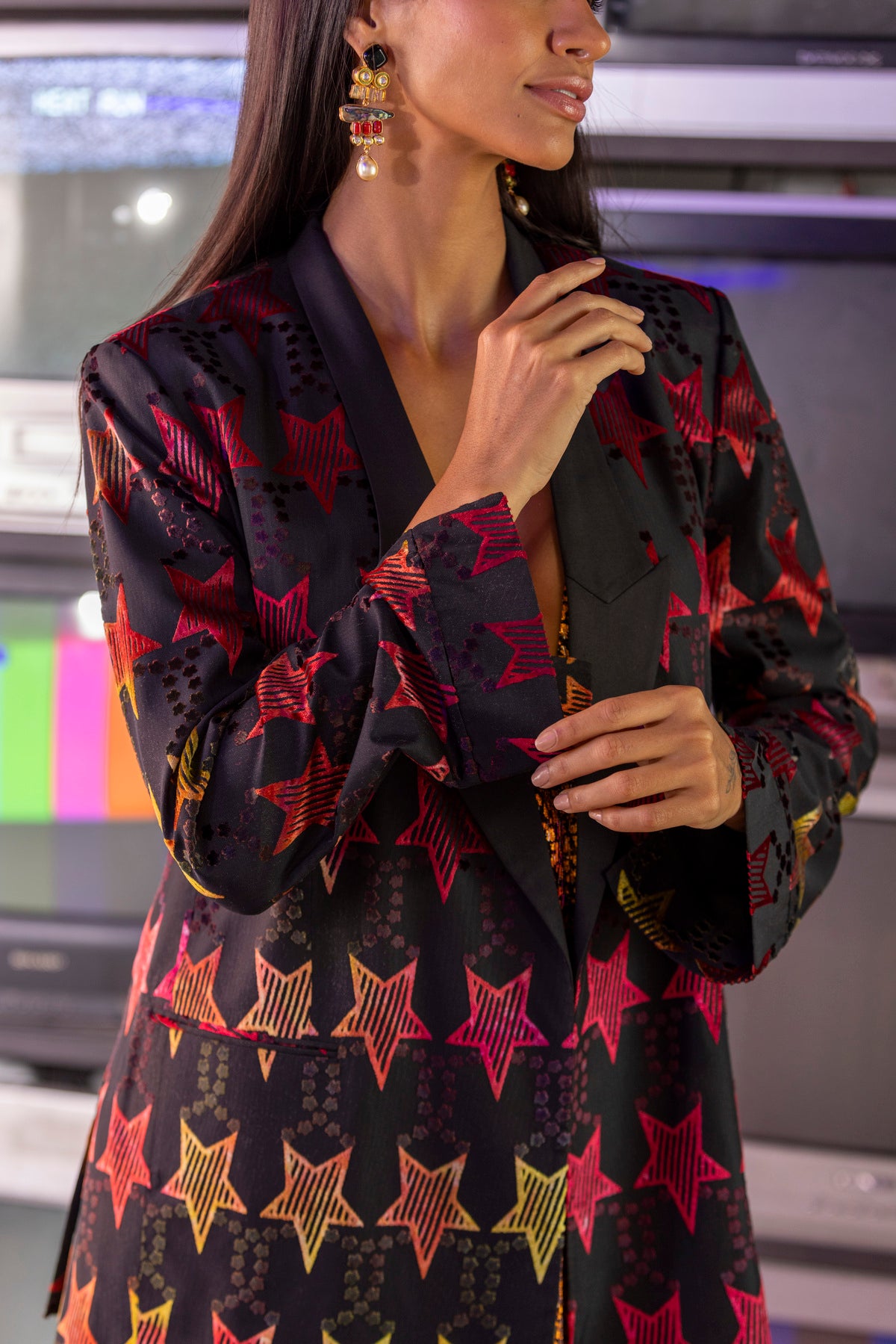 It’s our latest, classic, easy-to-wear, timeless piece in our fun velvet star prints , the fabric is beautiful, breathable & light . The perfect treasure-forever blazer jacket detailing in a relaxed, loose, works on everyone cut. It will definitely steal your heart and make any outfit extraordinary.