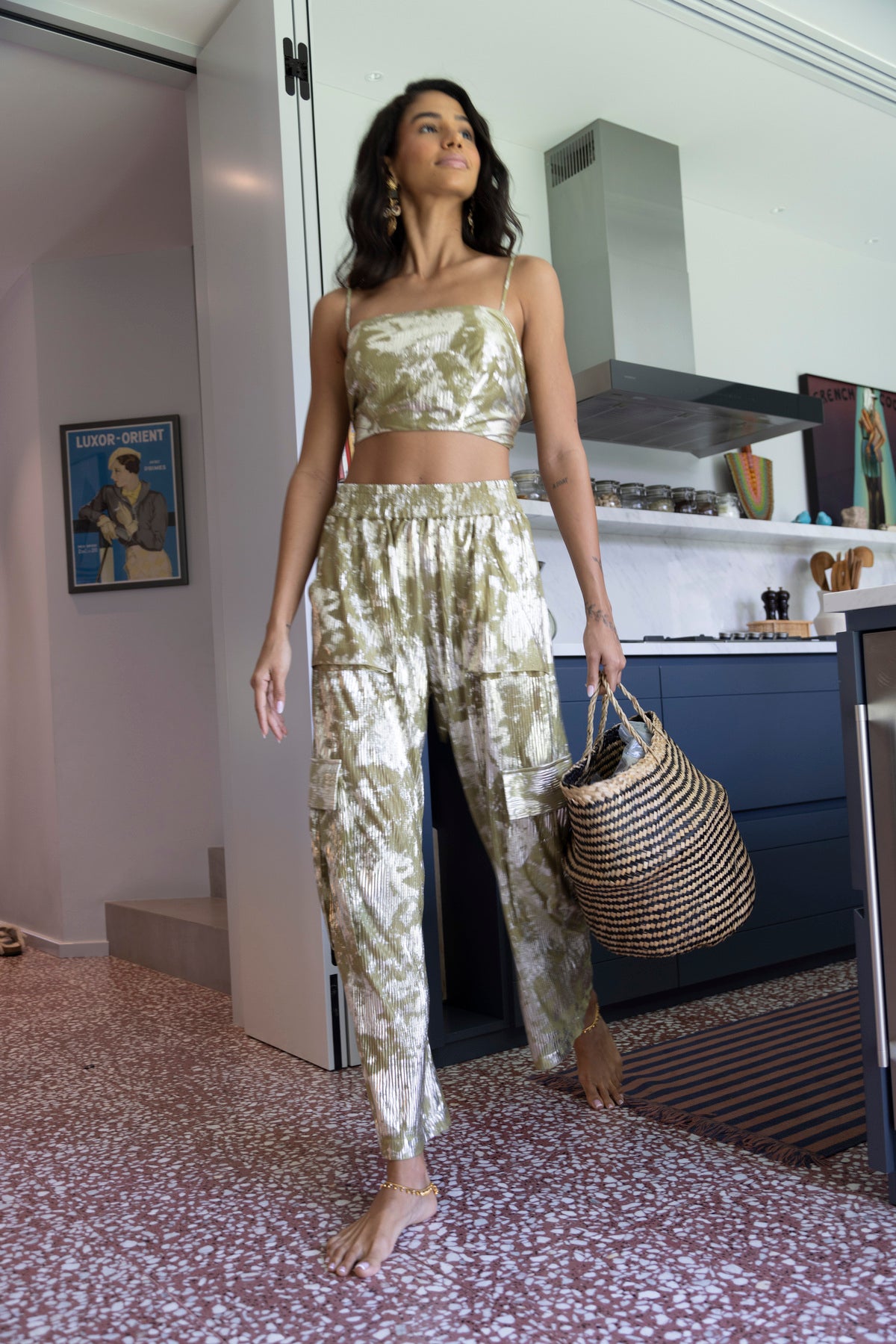Cargo pants with side pocketed that have a shimmery finish and matching top with spaghetti adjustable straps and tied back for a stylish look