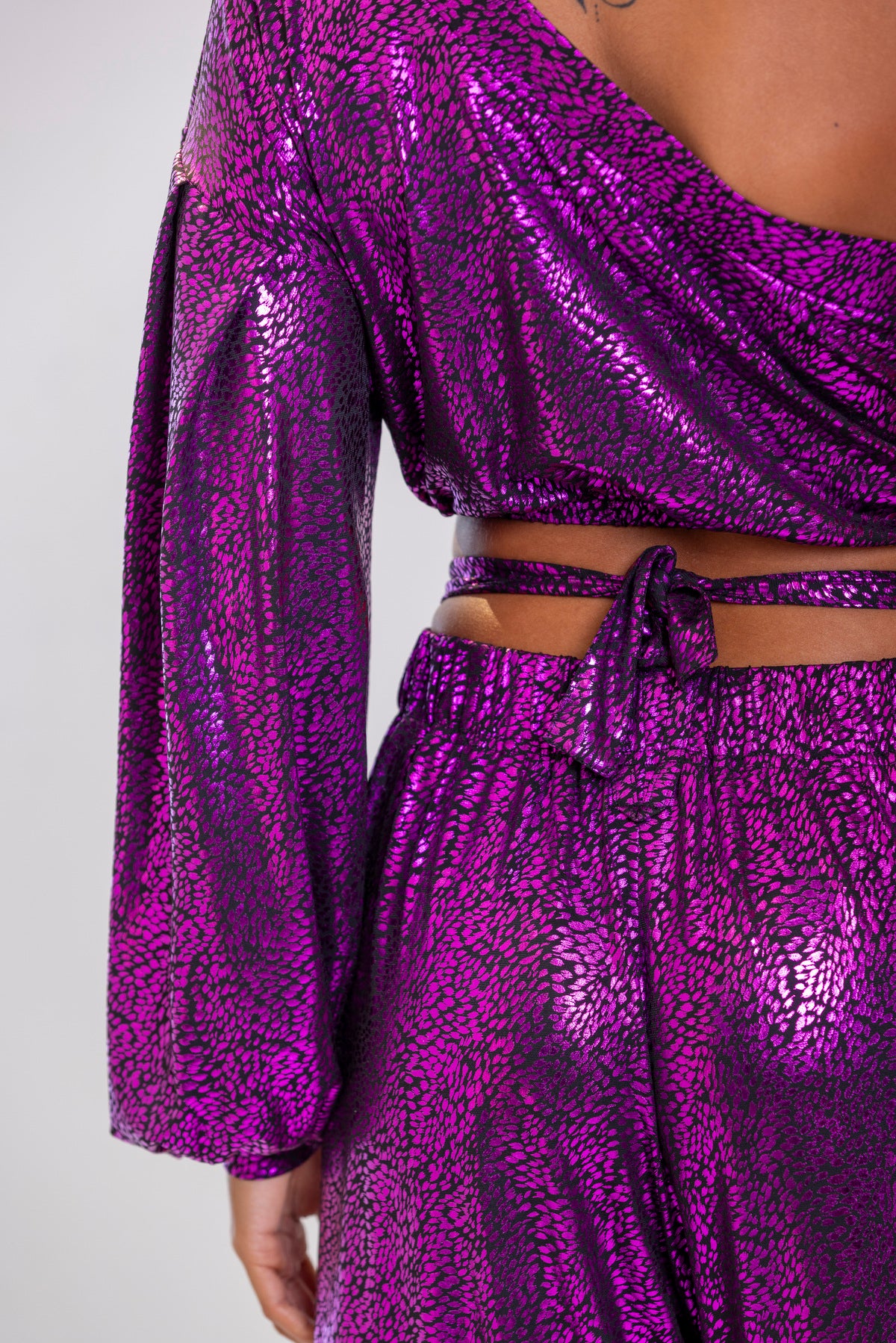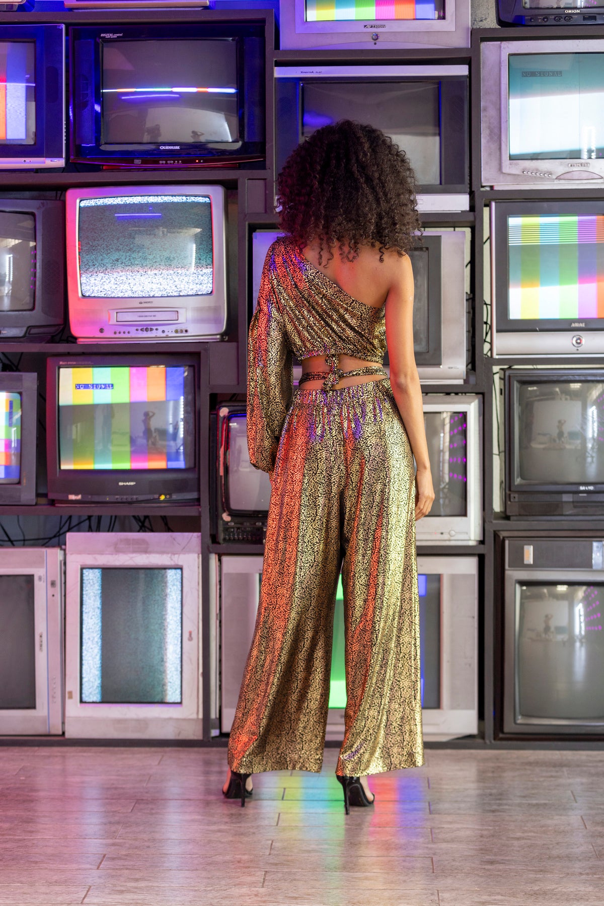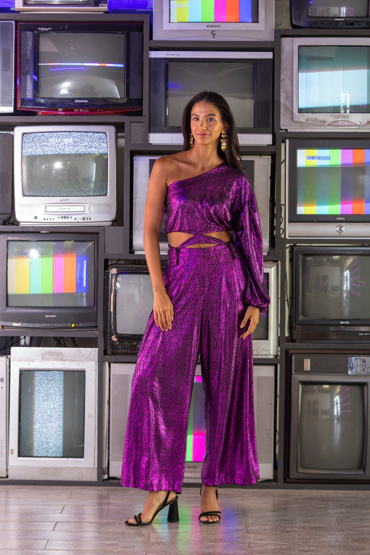 Dazzle in this one-shoulder puffy sleeve top paired with wide-leg pants, designed in a stunning metallic printed fabric—perfect for any festive night.