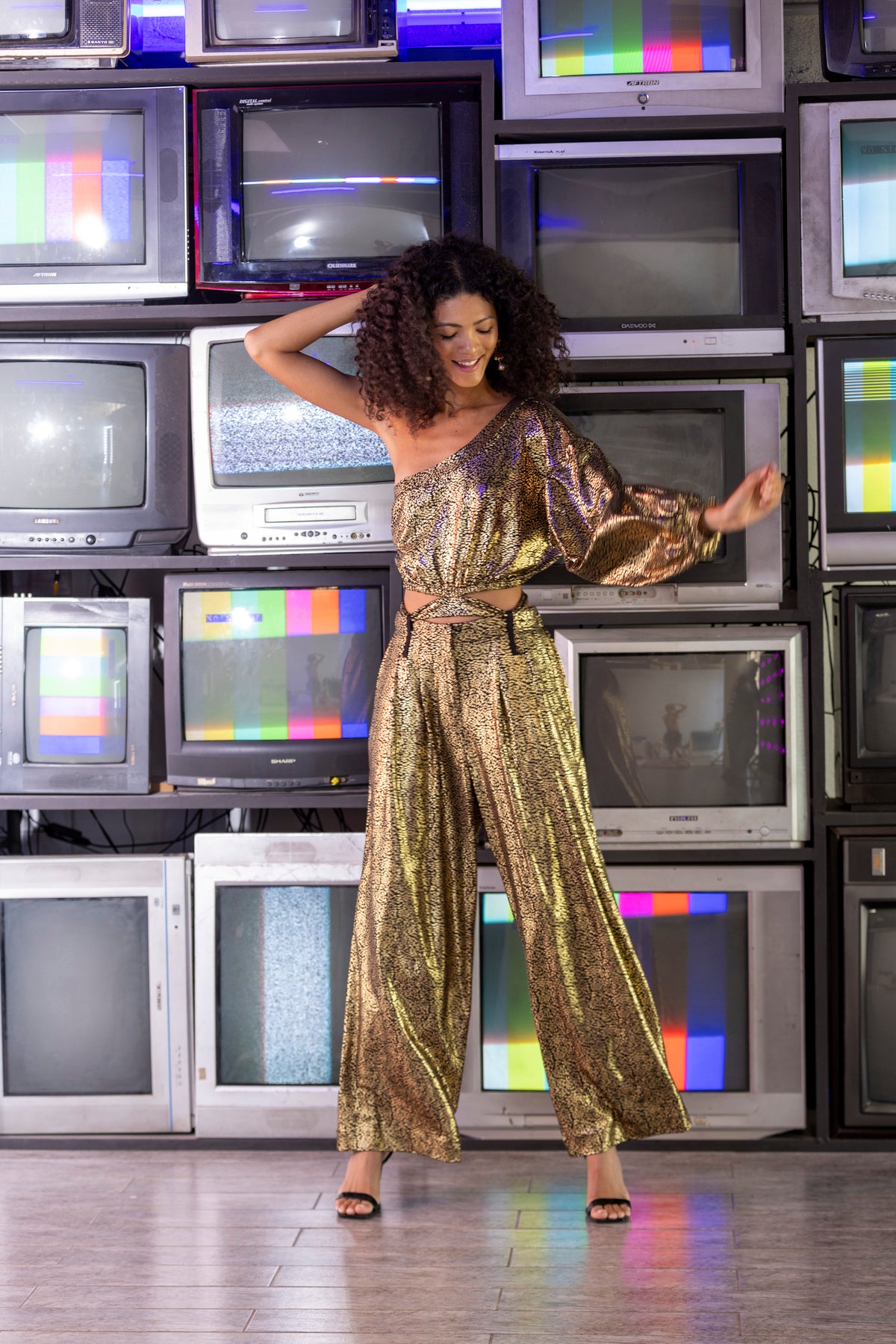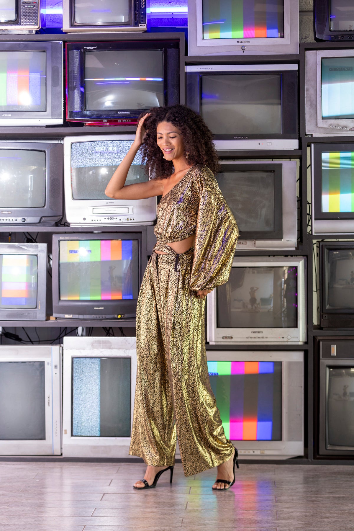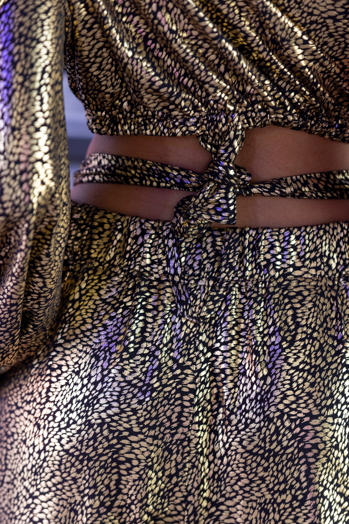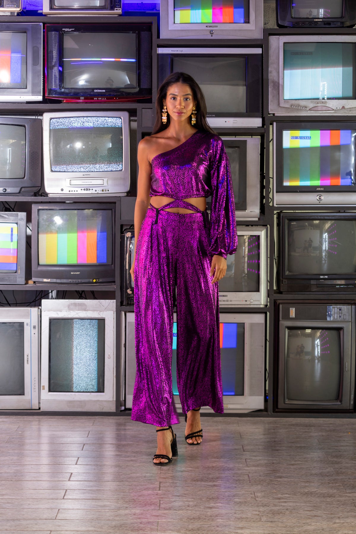 Dazzle in this one-shoulder puffy sleeve top paired with wide-leg pants, designed in a stunning metallic printed fabric—perfect for any festive night.