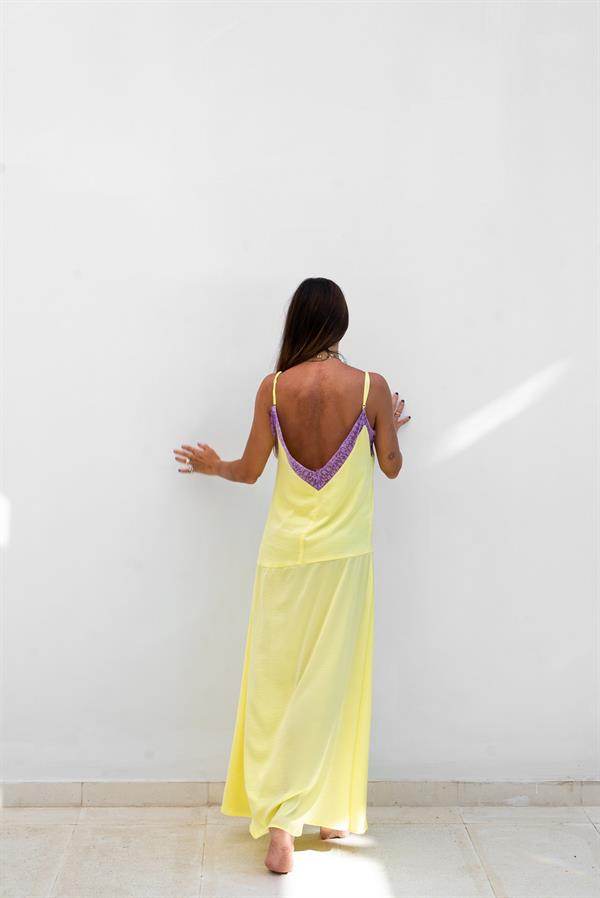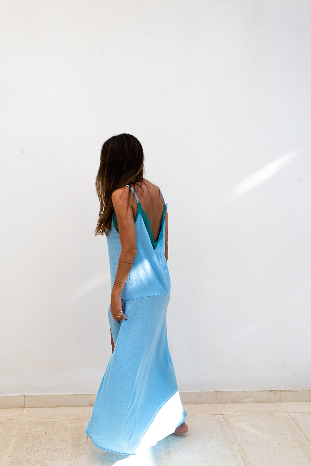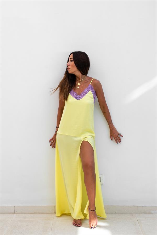 Here is another incredible, timeless slip dress. It’s romantic and feminine  cut makes it striking, fun and great with high front side slit its colorful lace detail.