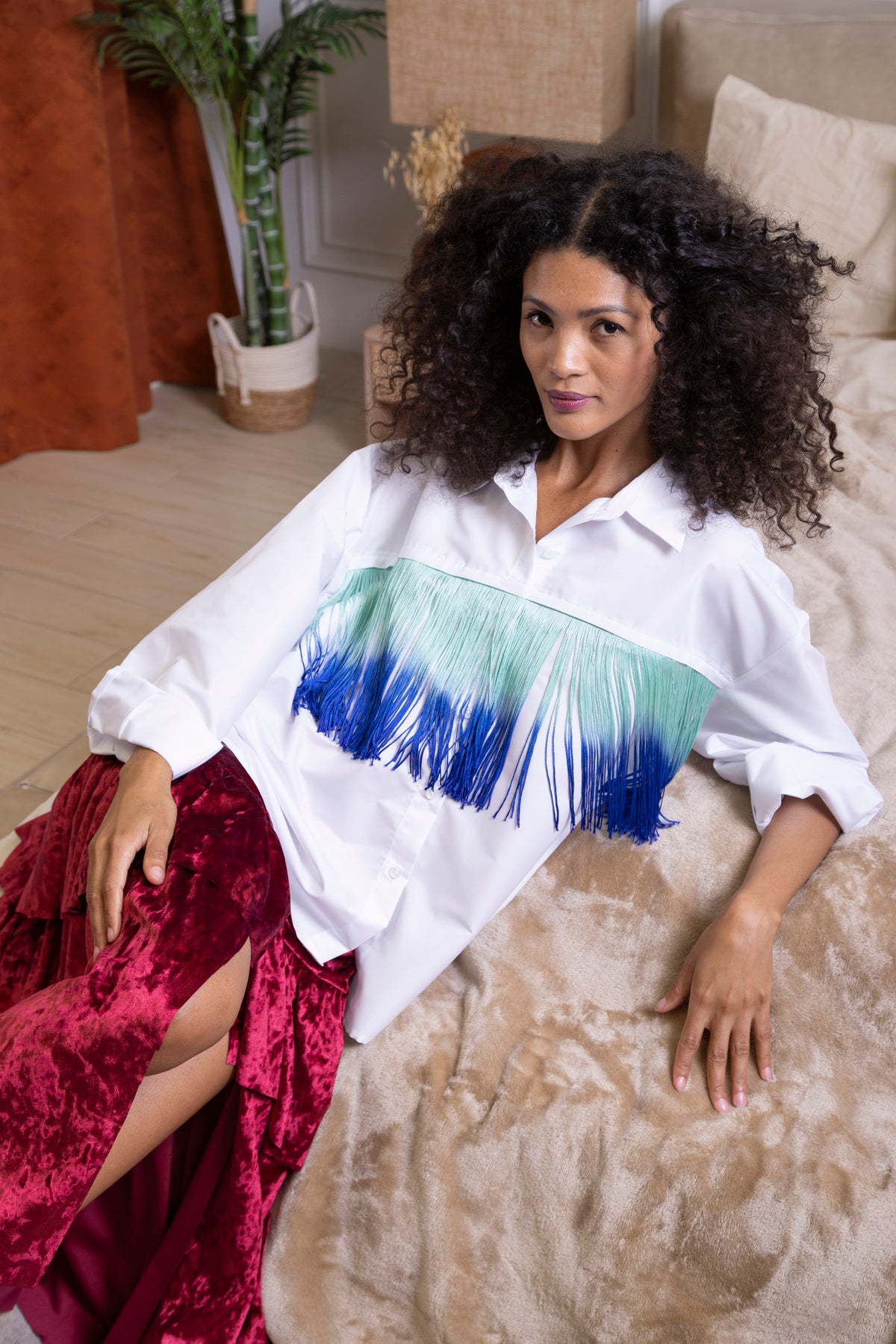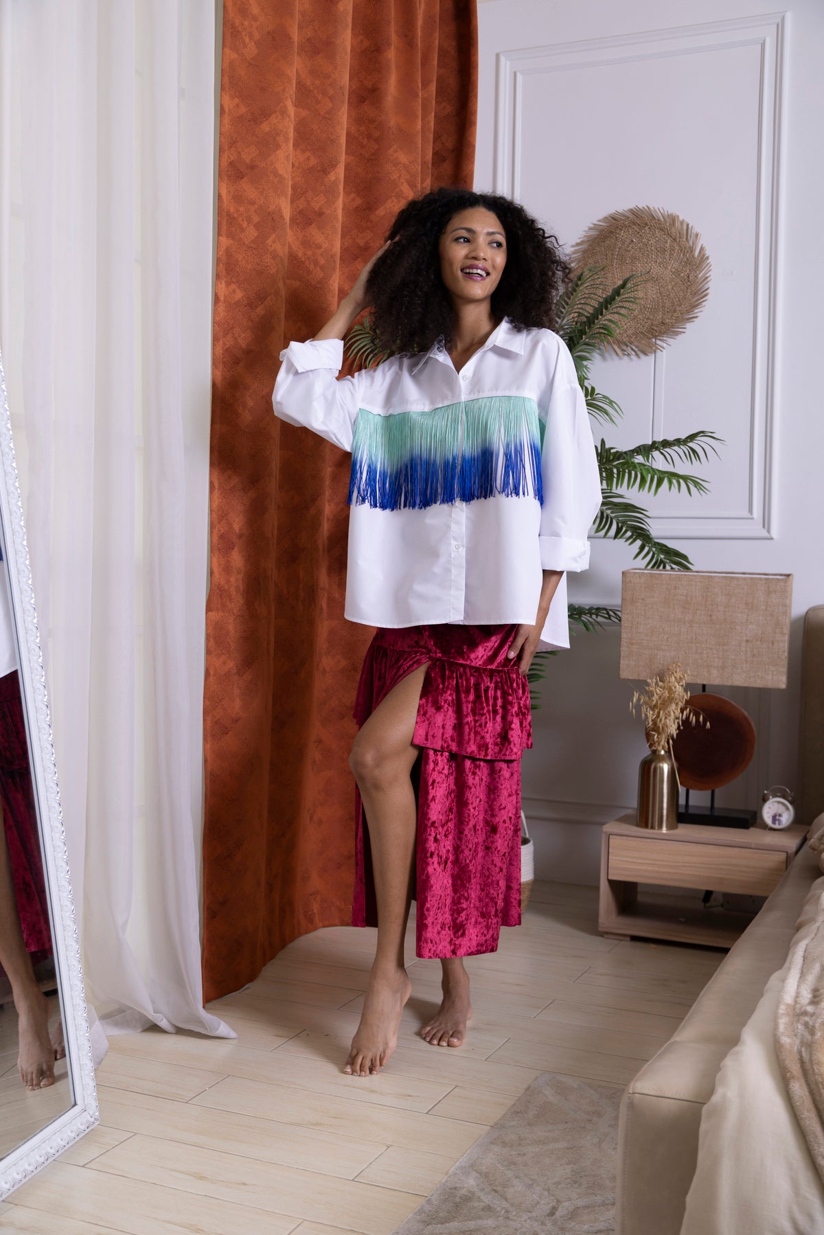 A must-have for the season: a fun and stylish double-layered velvet skirt with a front slit. Pair it with ankle boots and step out for a week night out.