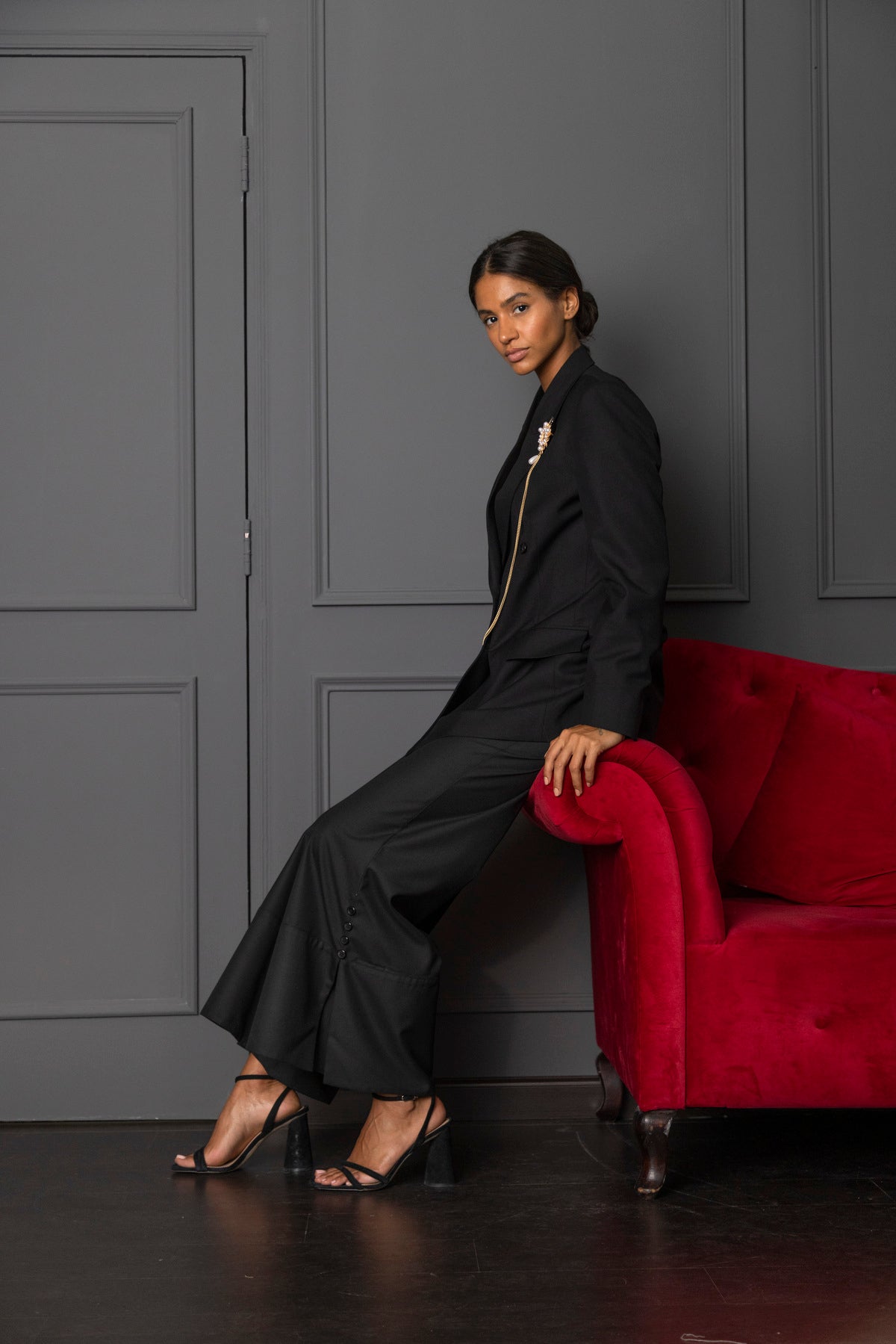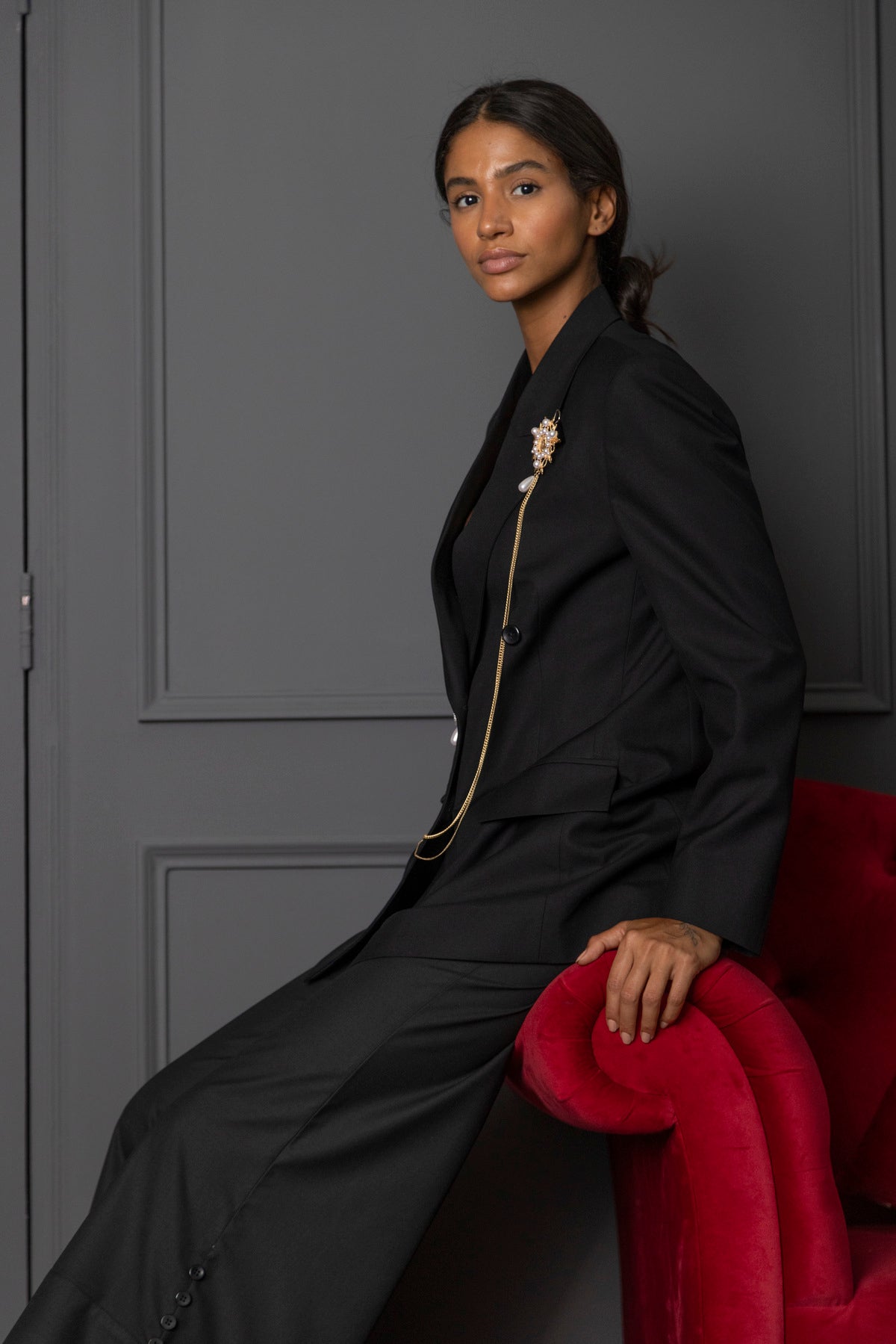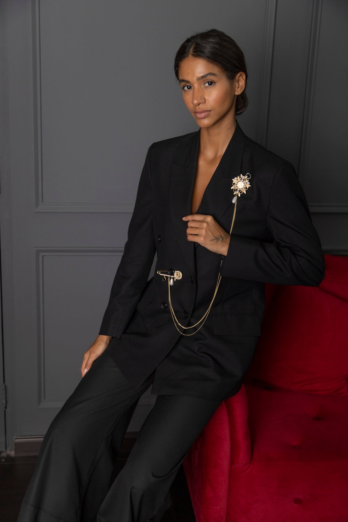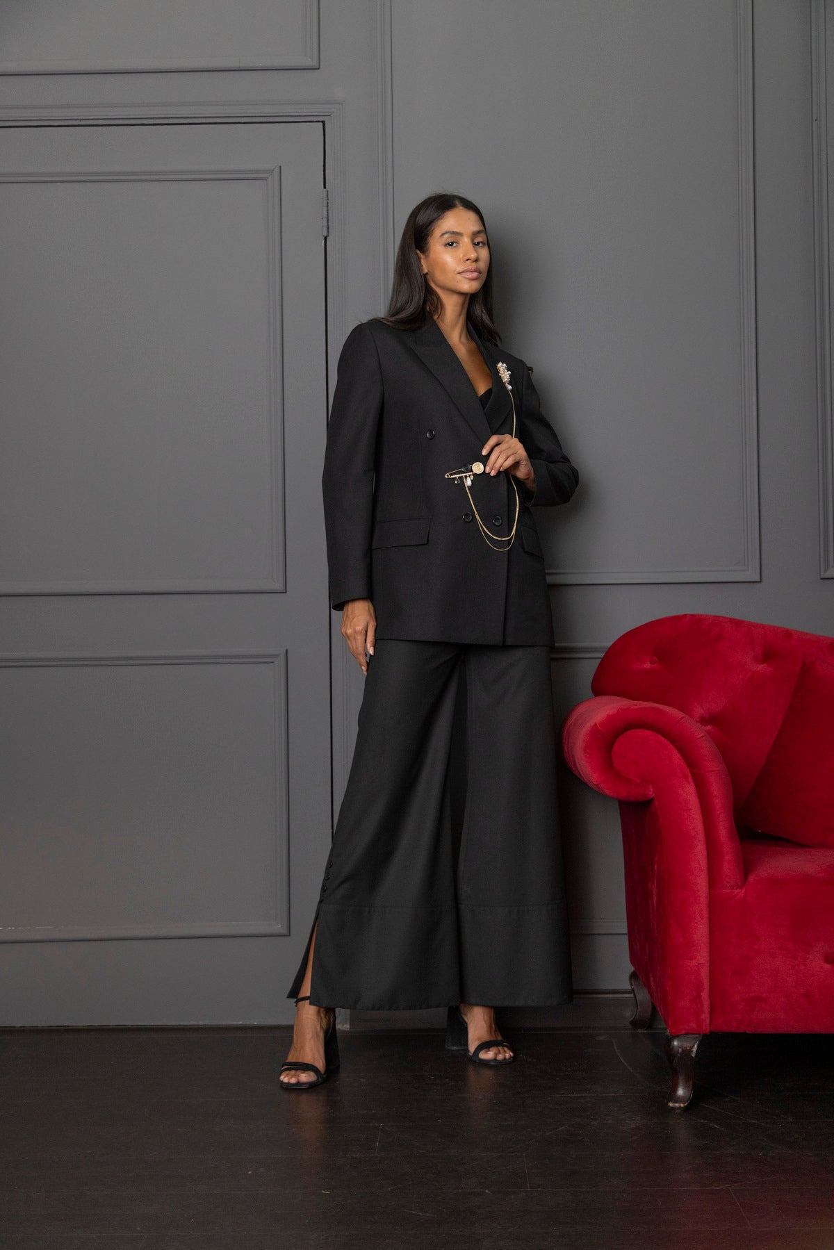 A sleek and stylish black suit tailored for women, exuding an edgy and sophisticated vibe that is perfect for any Bossy moment.