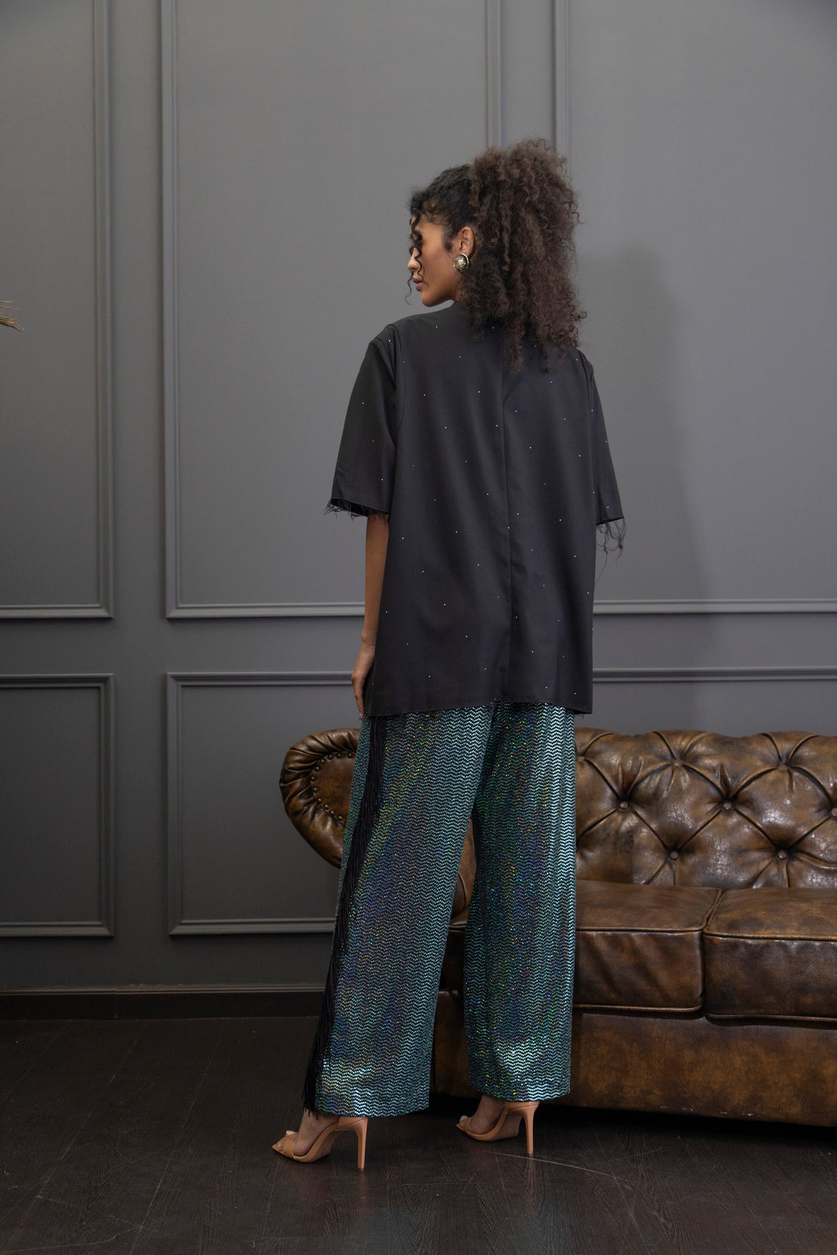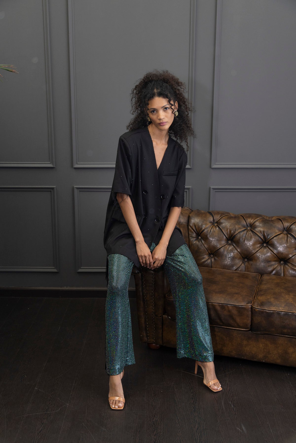 The puff shoulder detail adds a unique and trendy touch to this blazer, while the short sleeves make it perfect for all year round . The subtle sparkle of the stones adds a touch of glamour, making it a versatile piece that can be dressed up or down. This blazer is a great addition to any wardrobe, and is sure to make a statement wherever you wear it.
