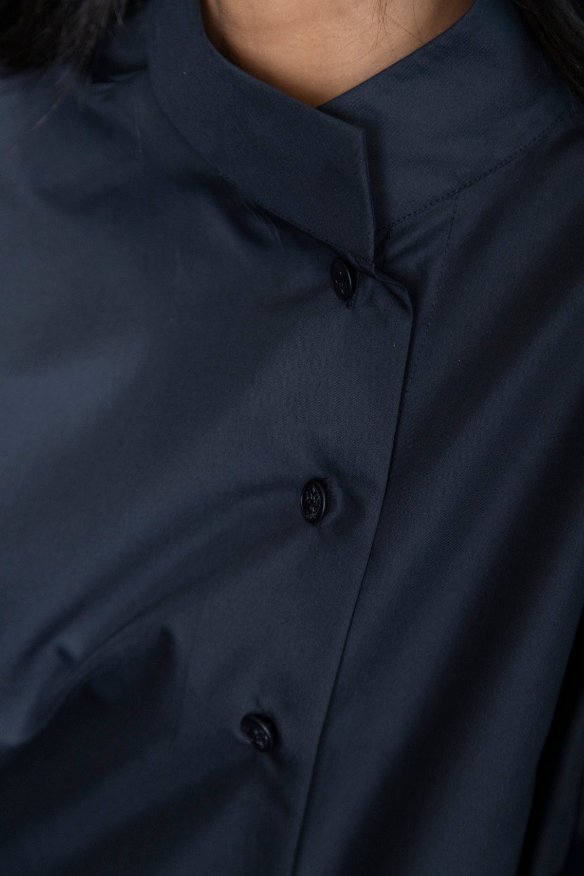 Make a bold statement in our high-collar, edgy black shirt . The asymmetrical shape with a short back and long front, along with beautifully hand-picked buttons that match the shirt, makes this piece truly unique. The raw finish adds an unexpected twist to this one-of-a-kind garment.