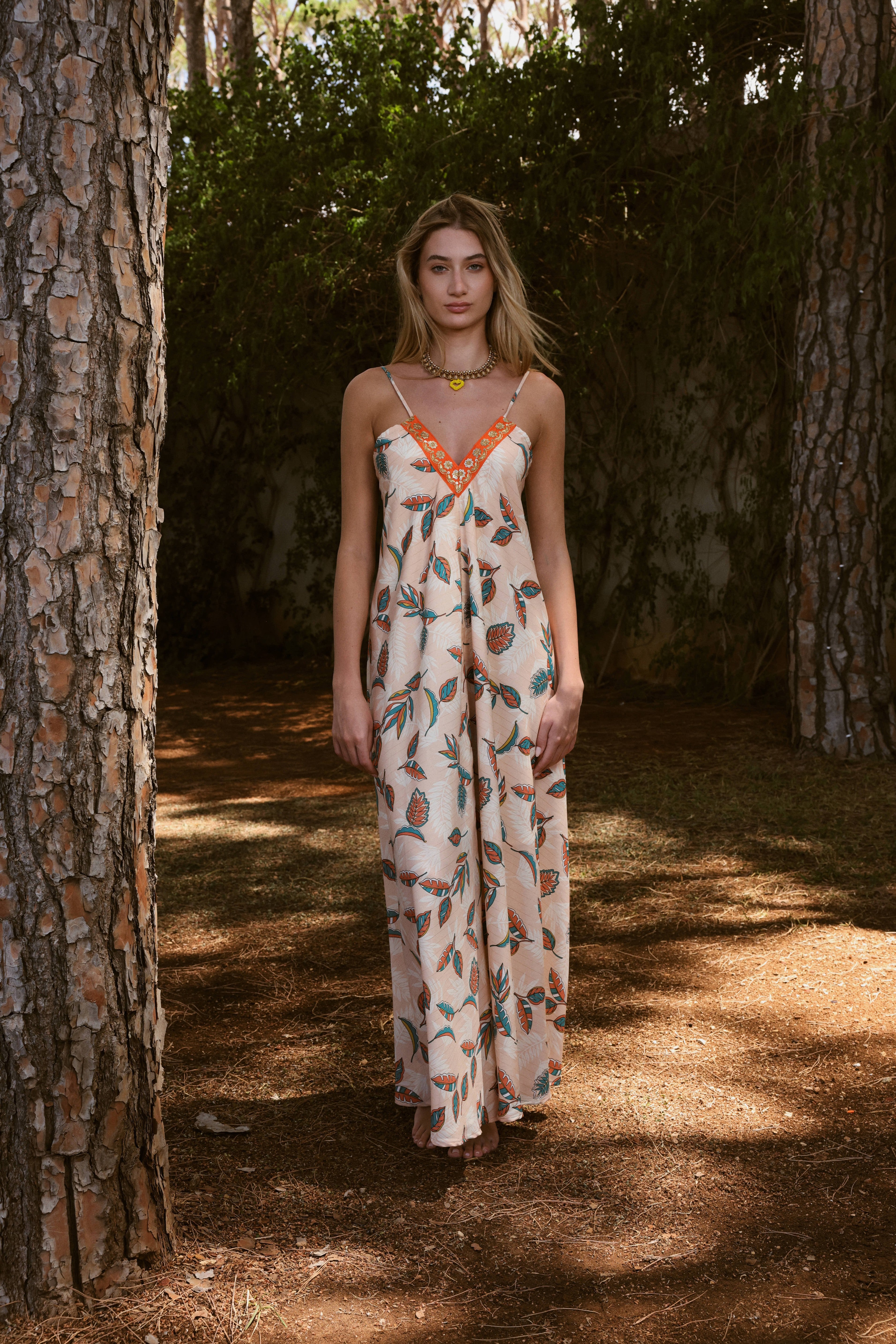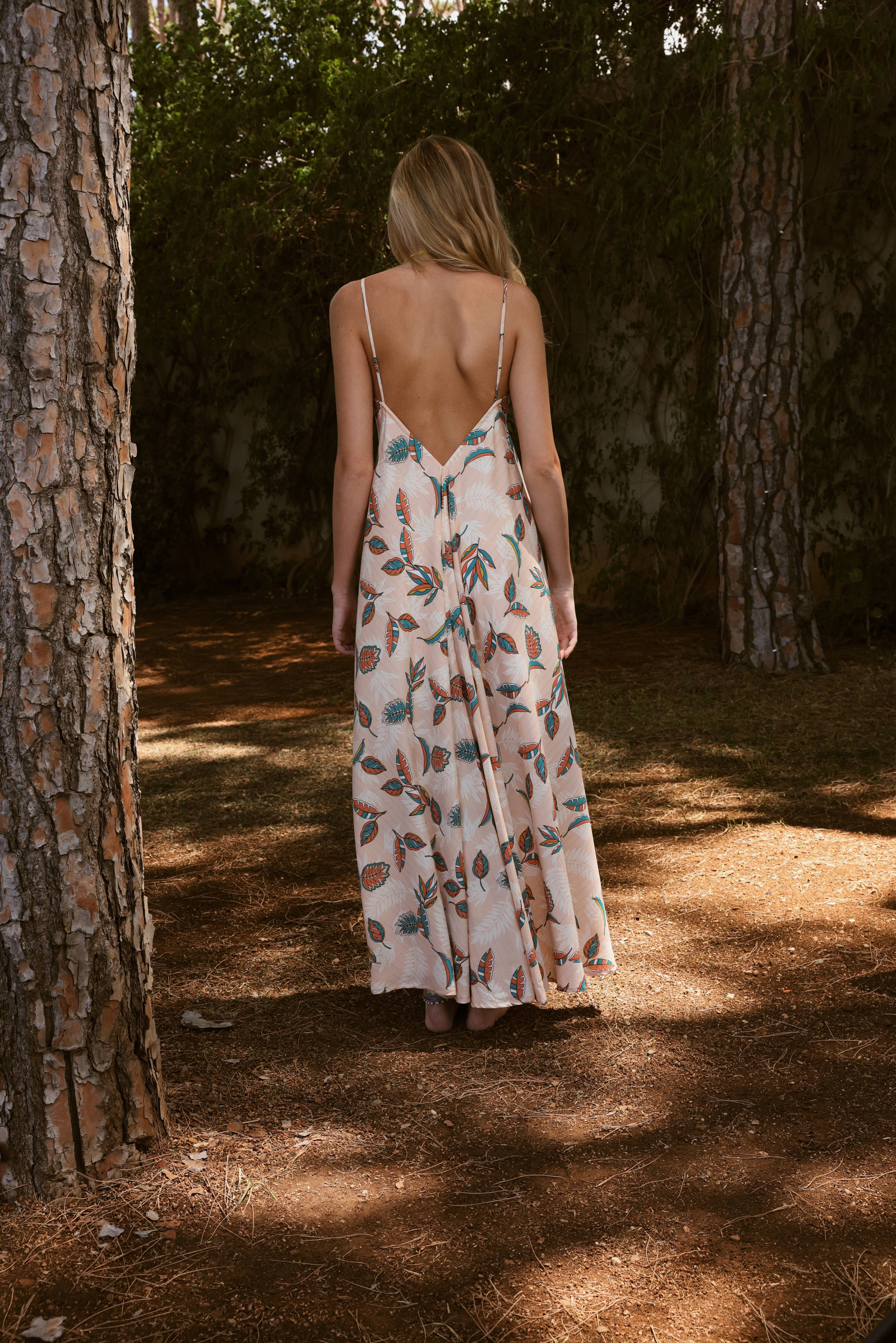 This V-dress is all about fluid elegance. Designed with a plunging neckline that elongates the silhouette and a striking front accent that instantly draws the eye, it flows with every step in cloud-soft fabric that feels weightless on the skin. A defined border detail adds structure to its clean cut, while the low back enhances its allure.